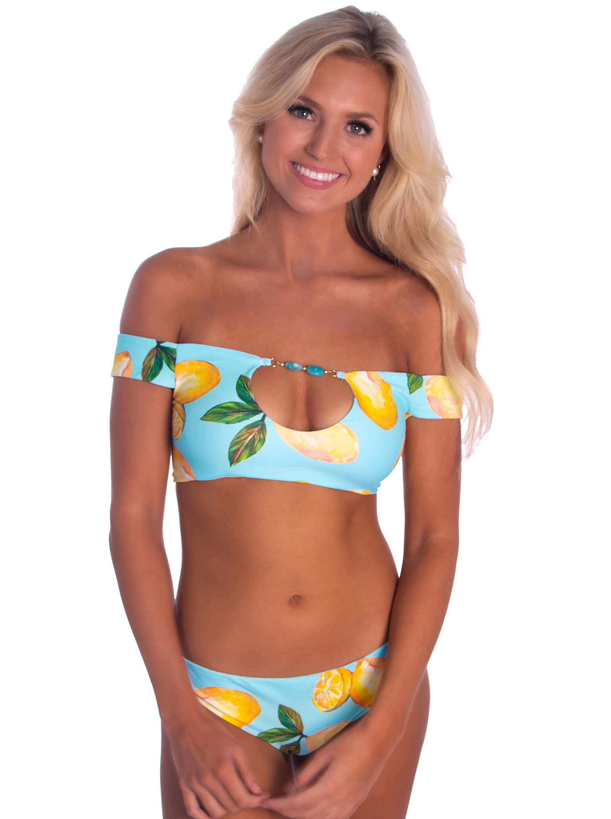 Jassmine Bikini Top in blue watercolor-inspired Lemon Print by Danni Baird. Seamless off-the-shoulder swimsuit top, ties behind back, reversible baby blue side, removable cups, and accented with Larimar gemstones and gold detail.