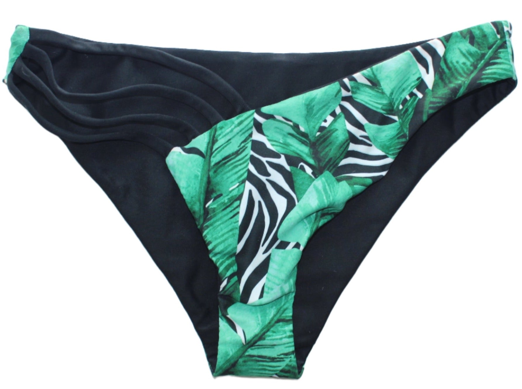 Maui bikini bottom in Welcome To The Jungle print and reversible Black. Seamless swimsuit. Available in medium and minimal coverage.
