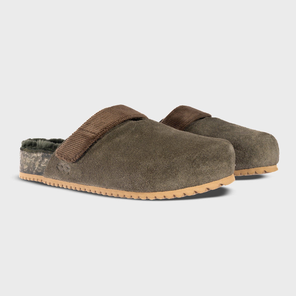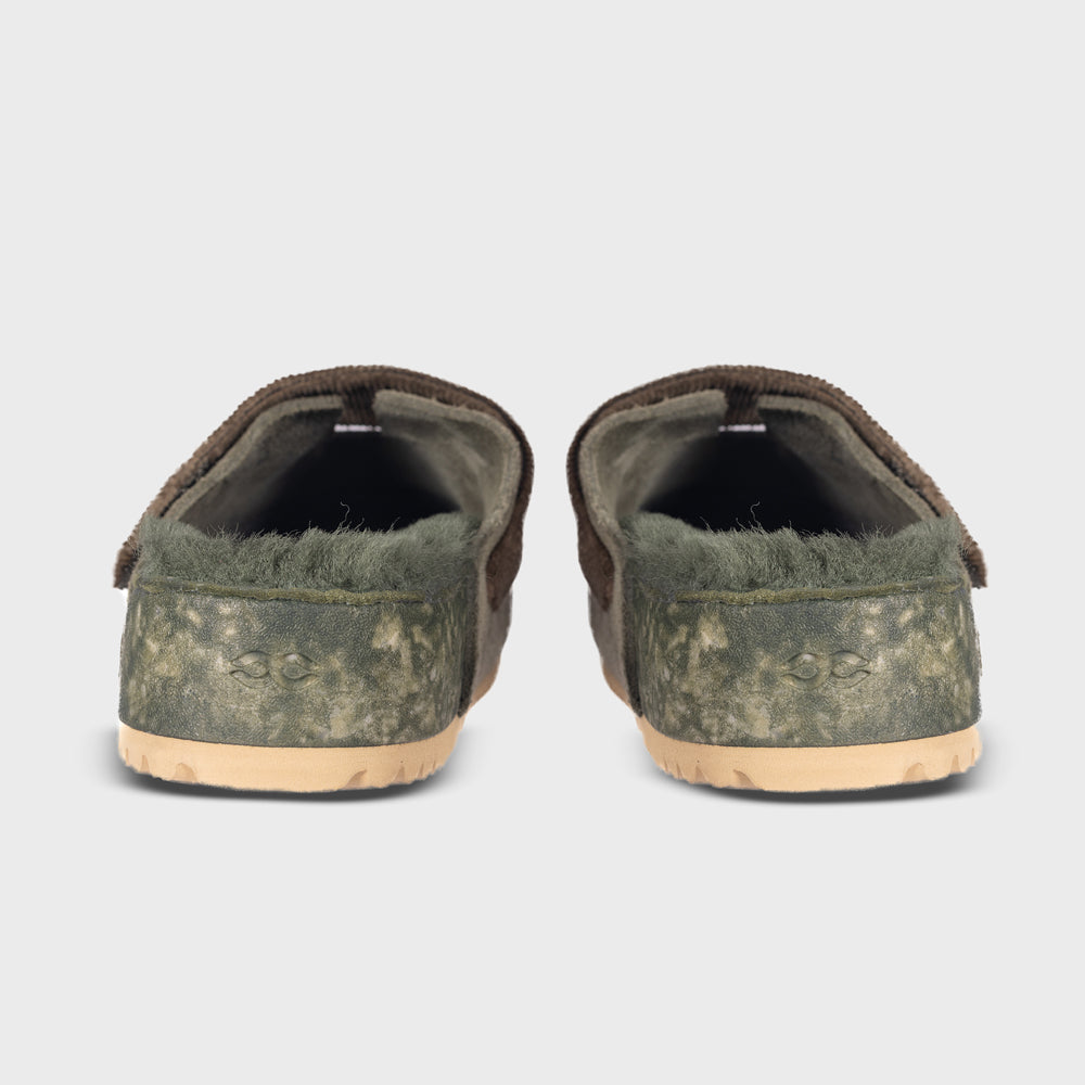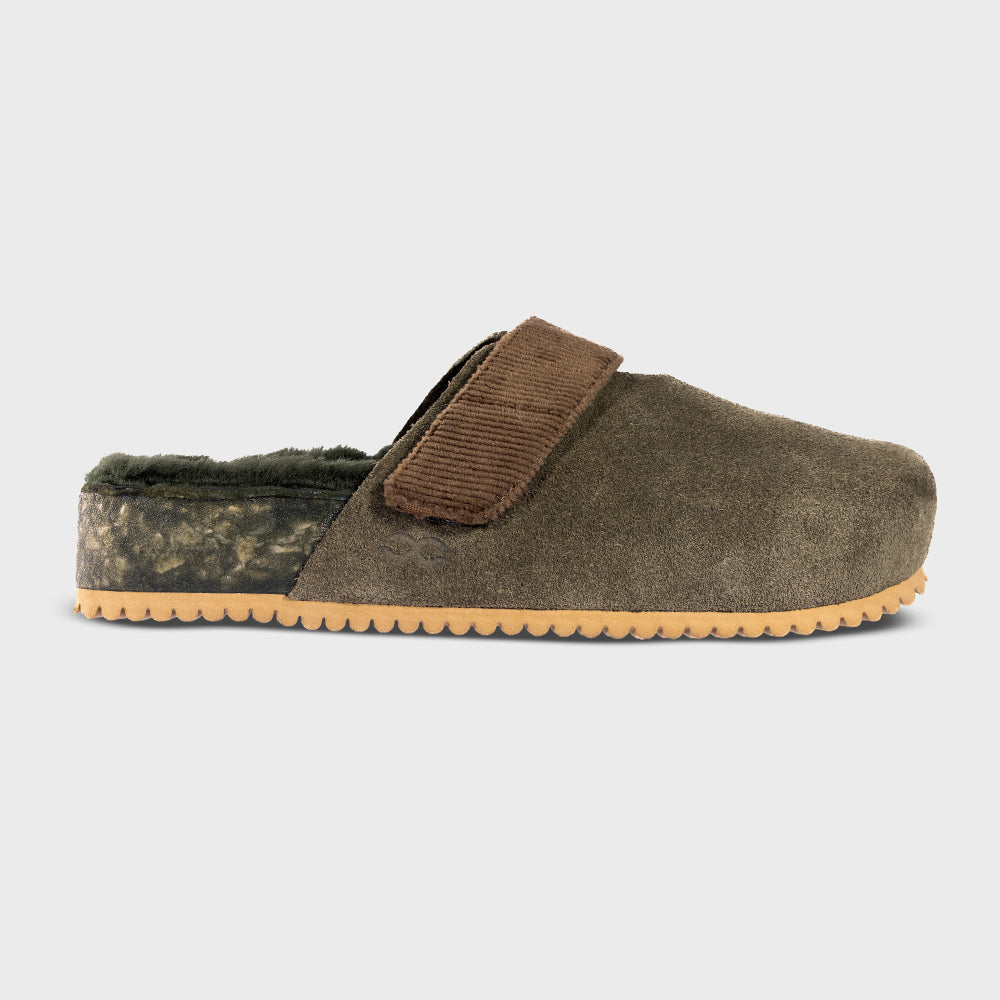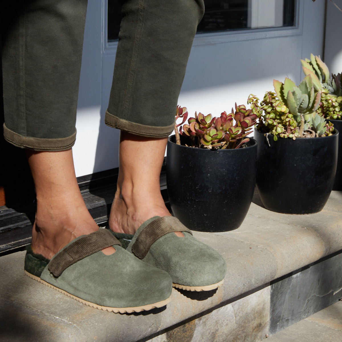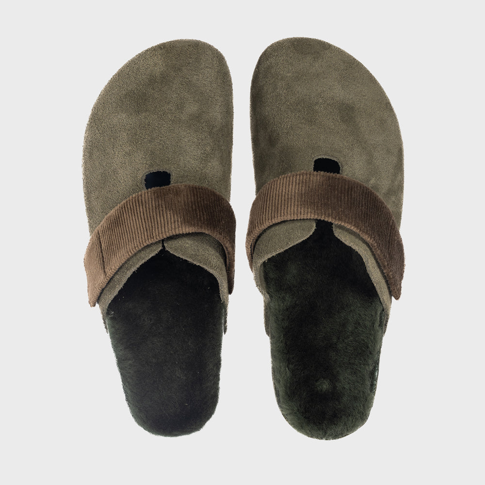 Rich suede creates the structure of the upper while a plush sheepskin footbed delivers cozy softness underfoot. A corduroy strap across the instep adds texture and adjustability, allowing the fit to adapt easily to your foot.